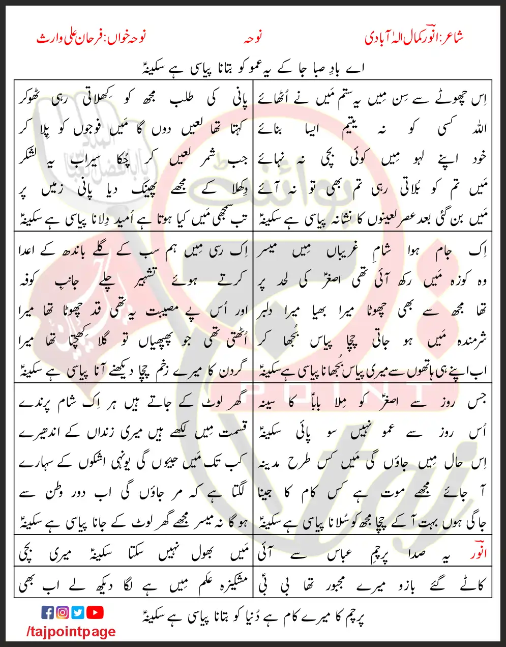 Aye Bad-e-Saba Ja Ke Ye Ammo Ko Batana Pyasi Hai Sakina Lyrics In Urdu 2016