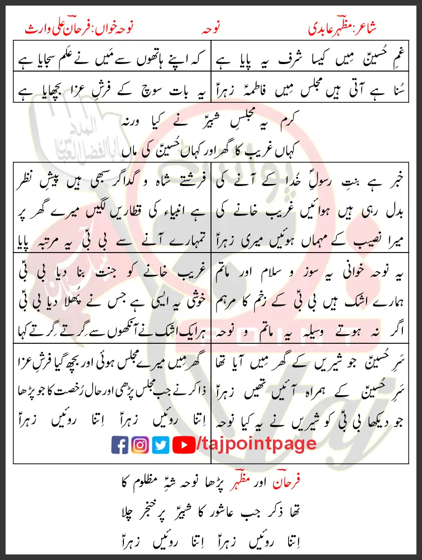Kahan Ghareeb Ka Ghar Our Kahan Hussain Ki Maa Lyrics Urdu 2017