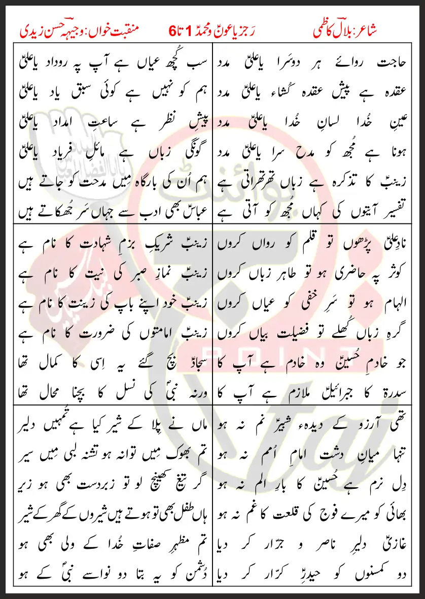 Rajaz Ya Aoun-o-Muhammad 1-6 Lyrics In Urdu Syed Wajhi Hasan Zaidi