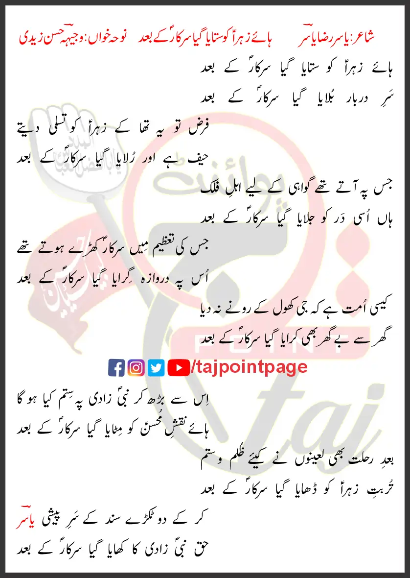 Haye Zahra Ko Sataya Gaya Sarkar Ke Bad Lyrics In Urdu 2014