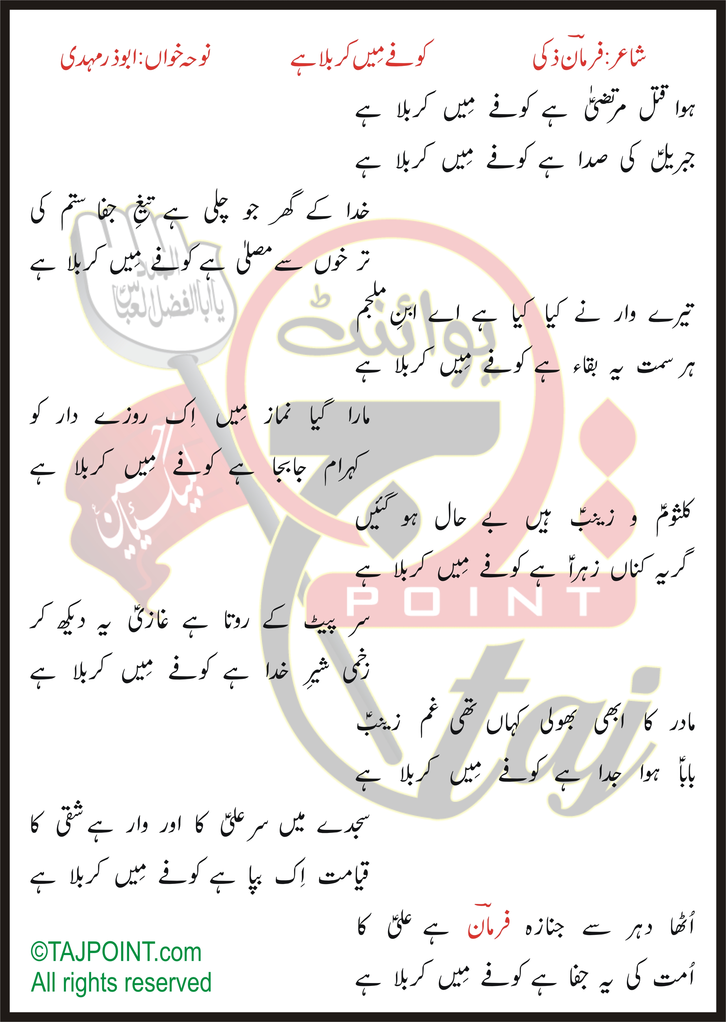 Kofay Mein Karbala Hai Lyrics In Urdu and Roman Urdu
