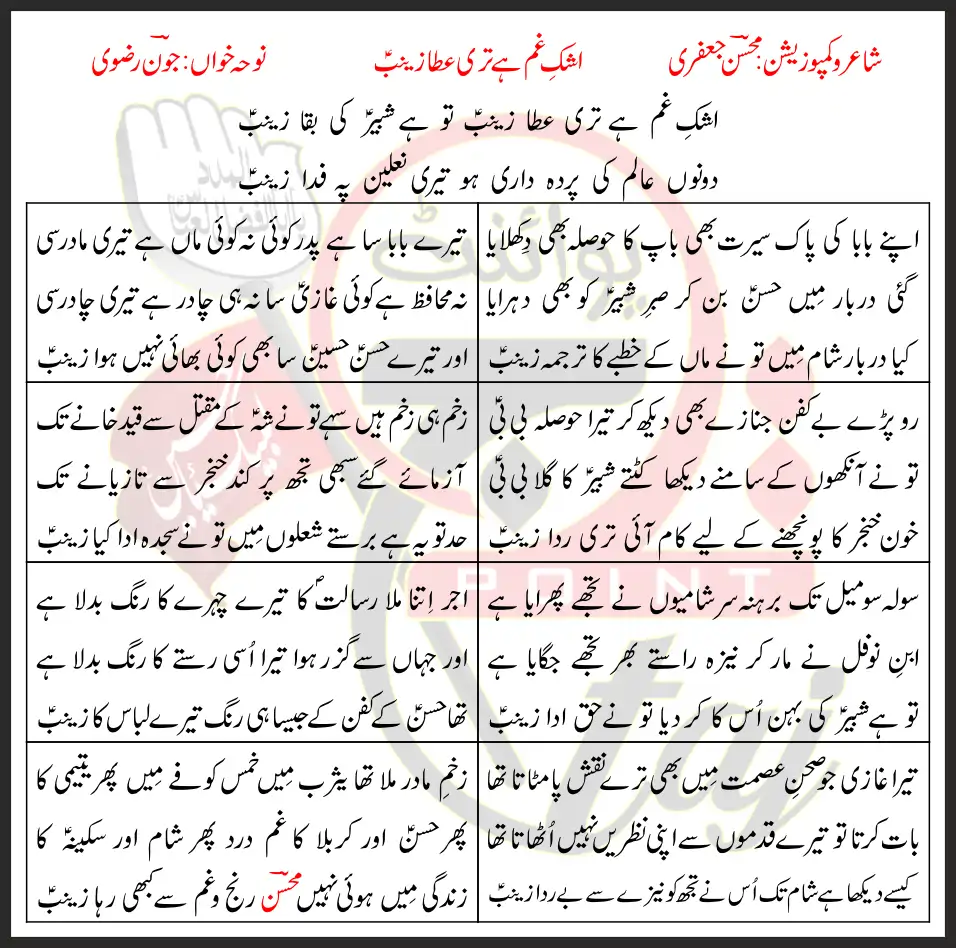 Ashk e Gham Hai Teri Atta Zainab Lyrics In Urdu Joan Rizvi