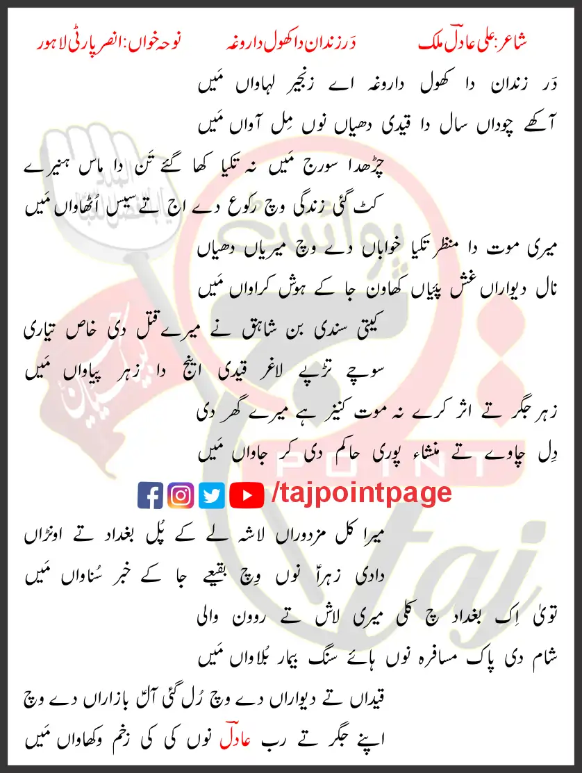 Dar Zindan Da Khol Daroga Aye Zanjeer Lahawan Main.
