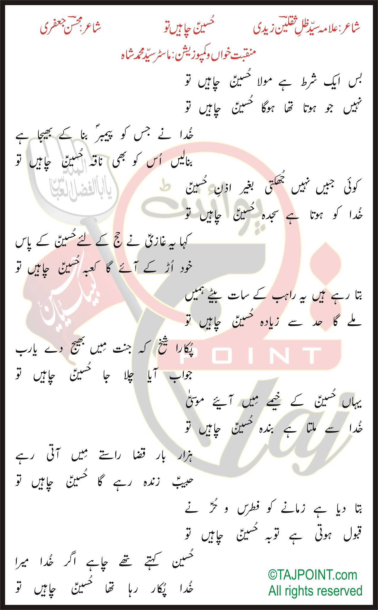 Hussain Chahein Tu – Syed Mohammad Shah Lyrics In Urdu and Roman Urdu