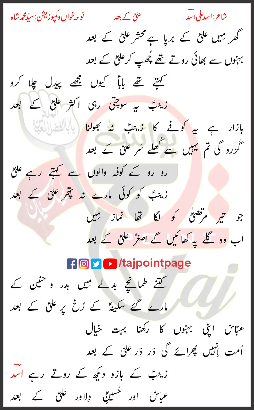 Ali Ke Bad Syed Mohammad Shah Lyrics Urdu 2021