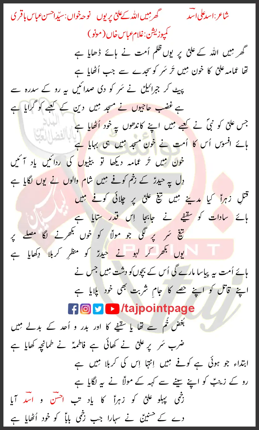 Ghar Mein Allah Ke Ali Par Yun Syed Ahsan Abbas Baquri Lyrics In Urdu and Roman Urdu