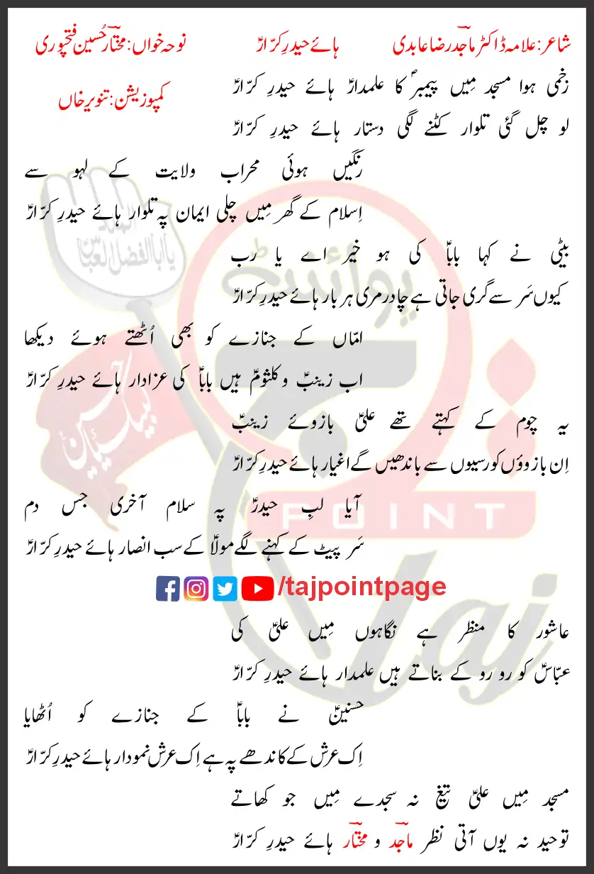 Haye Haider e Karrar Mukhtar Hussain Fatehpuri Lyrics Urdu 2022