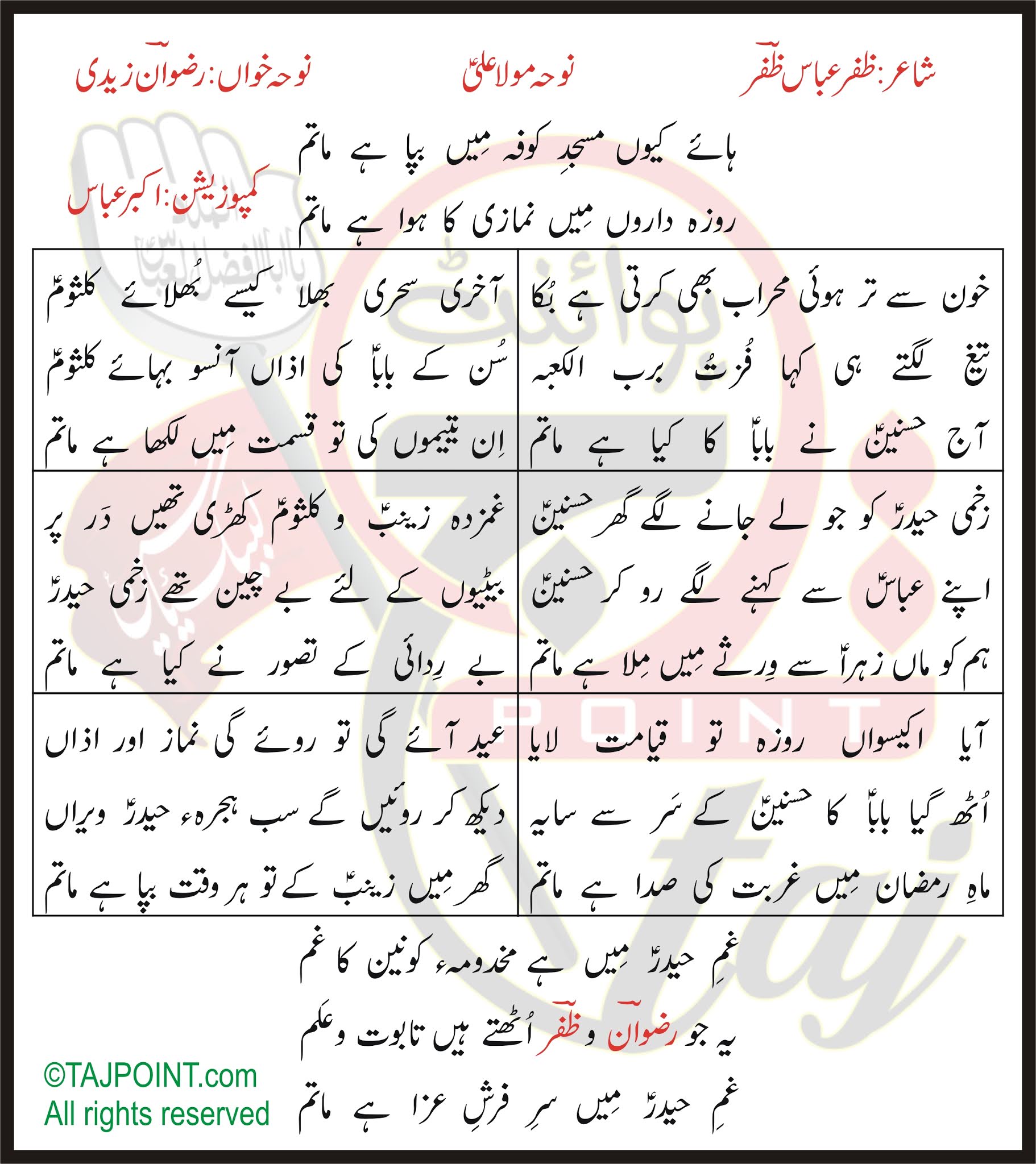 Matam e Ali Rizwan Zaidi Lyrics In Urdu and Roman Urdu