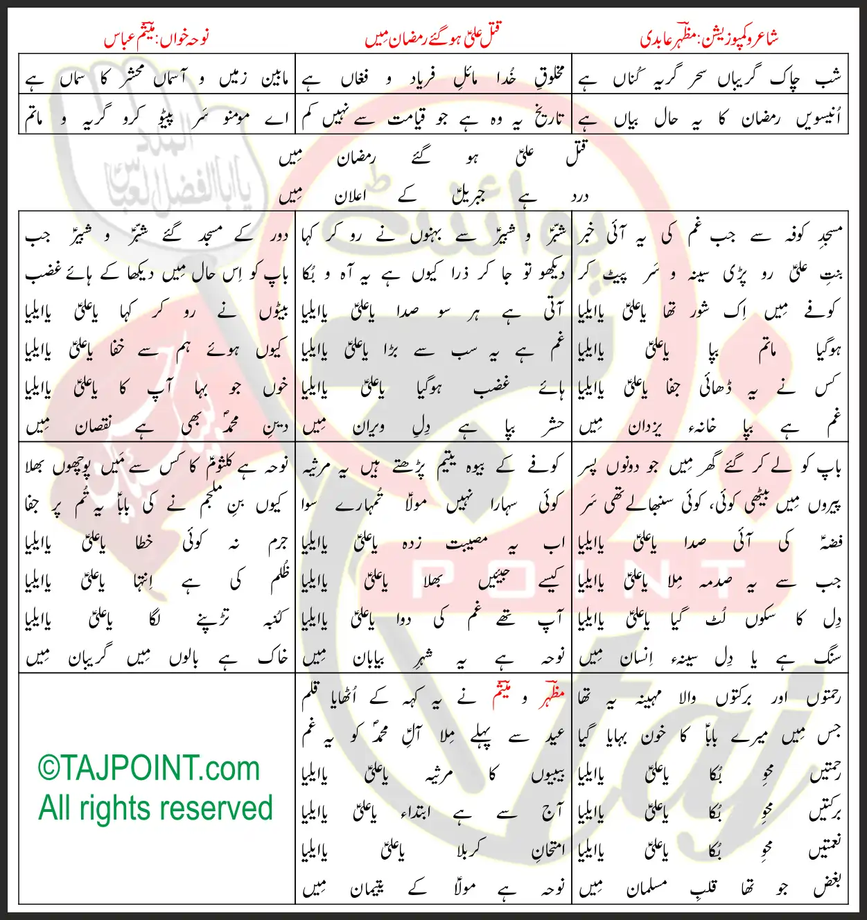 Qatl Ali Hogaye Ramzan Mein Mesum Abbas Lyrics In Urdu