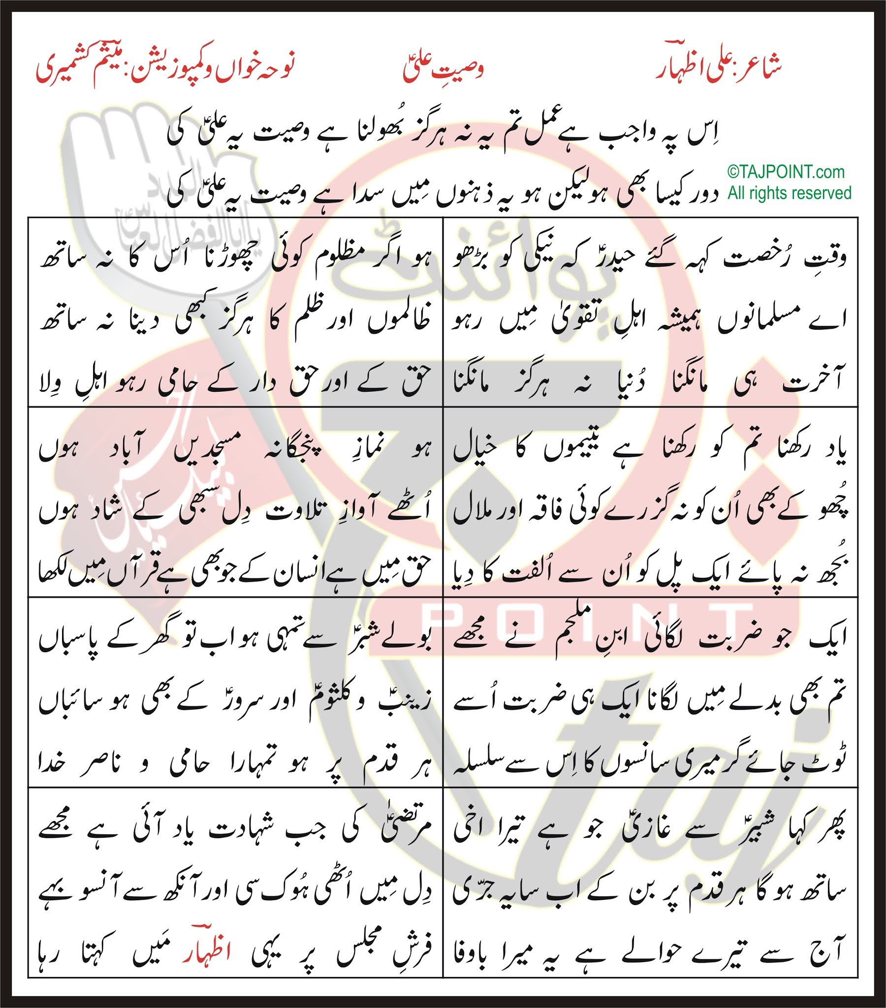 Waseyat-e-Ali Meesum Kashmiri Lyrics In Urdu and Roman Urdu