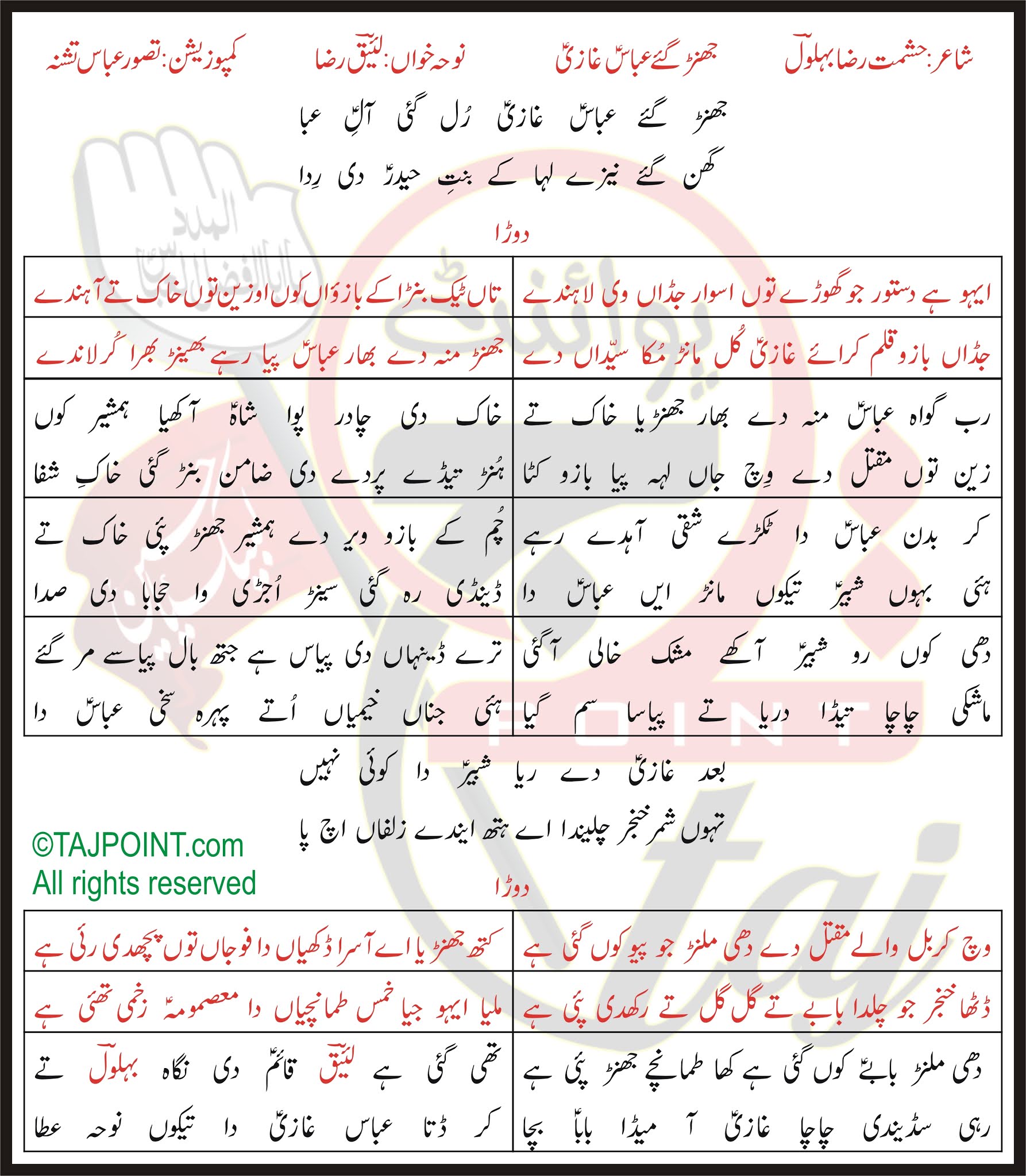 Jhanrr Gaye Abbas Ghazi Laeeq Raza Lyrics in Saraiki and Roman Saraiki