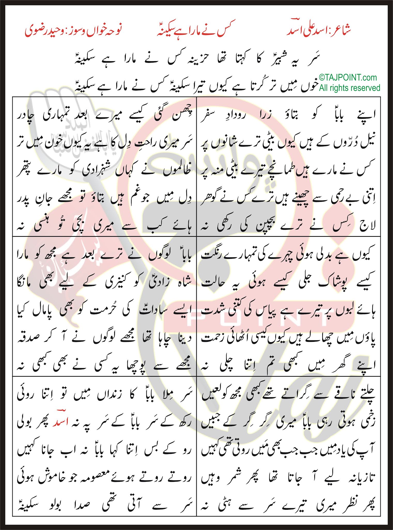 Khoon Mein Tar Kurta Hai Kyun Tera Sakina Kis Ne Mara Hai Sakina.