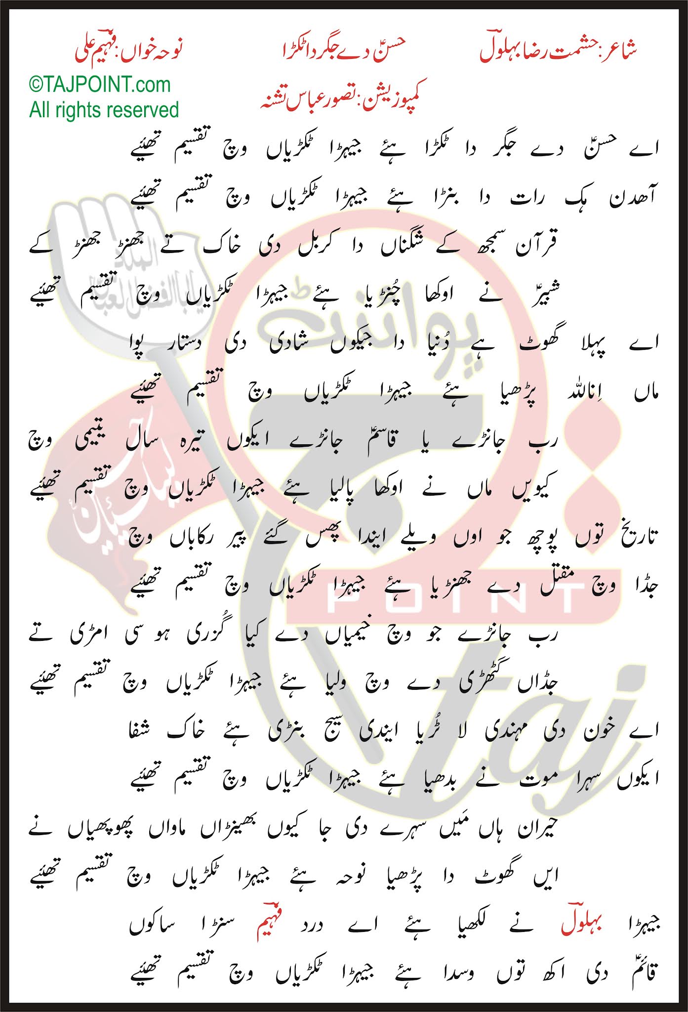 Ayein Ghoot Da Parhya Noha Hay Jehra Tukriyaan Wich Taqseem Theye.