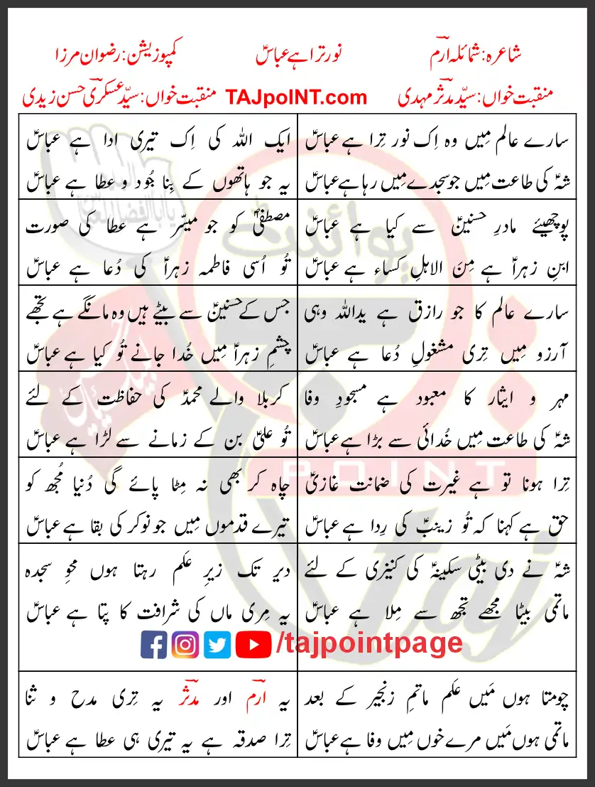 Noor Tera Hai Abbas Lyrics in Urdu Syed Mudassir Mehdi Syed Askari Hasan Zaidi 2022