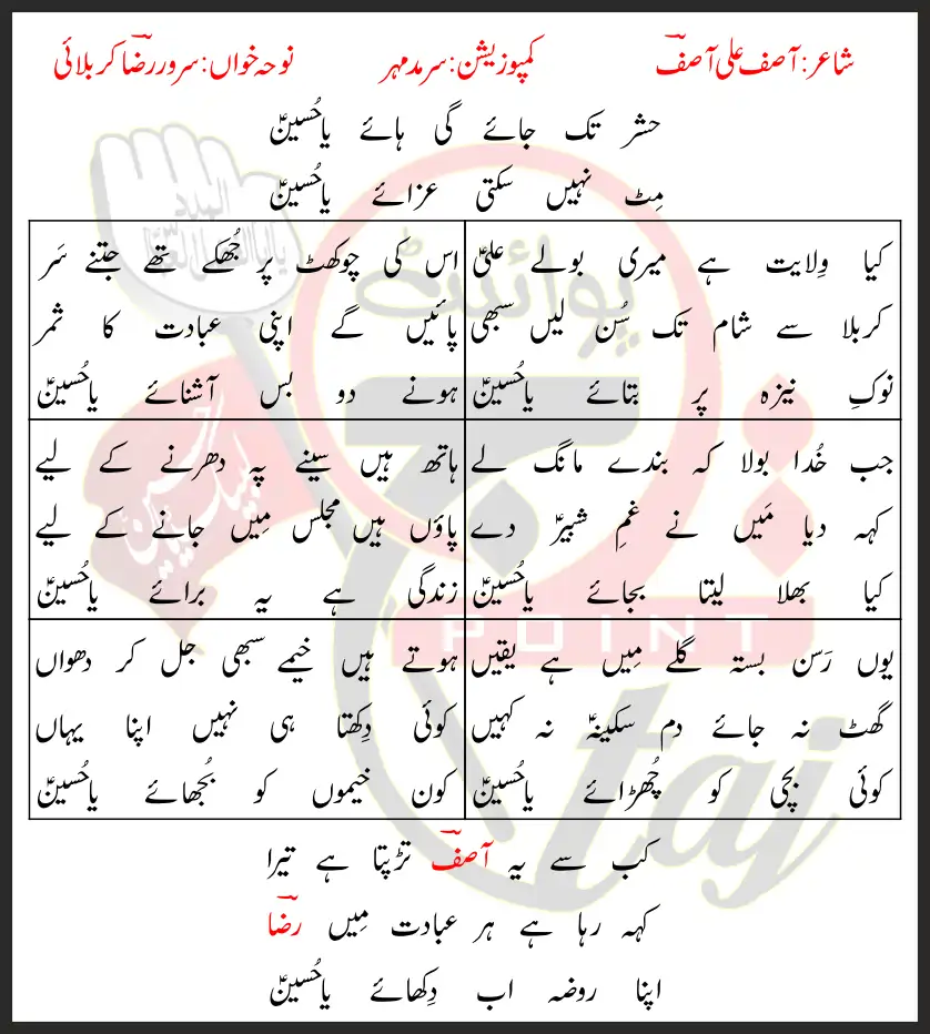 Haye Ya Hussain Sarwar Raza Karbalai Lyrics In Urdu 2022