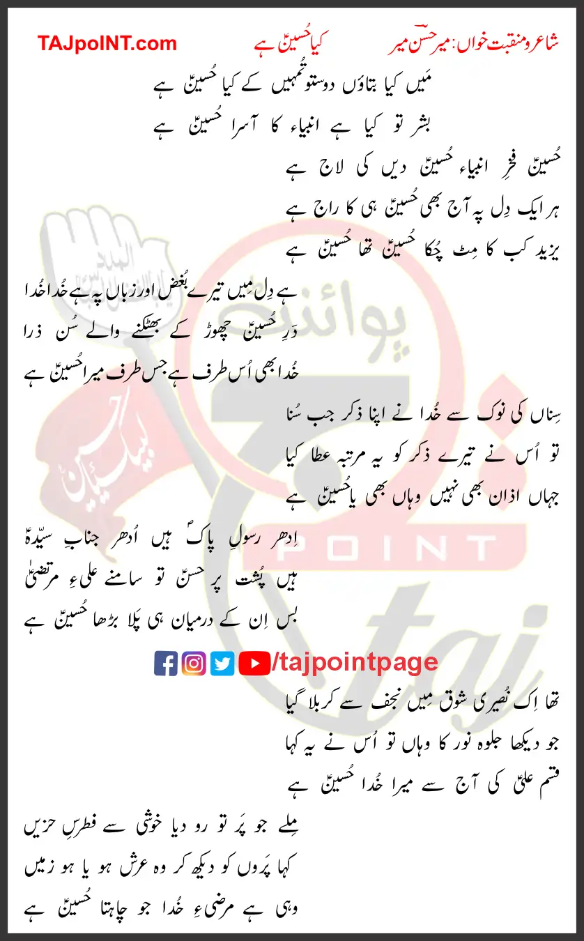 Main Kya Bataon Dosto Tumhein Ke Kya Hussain Hai Mir Hasan Mir.