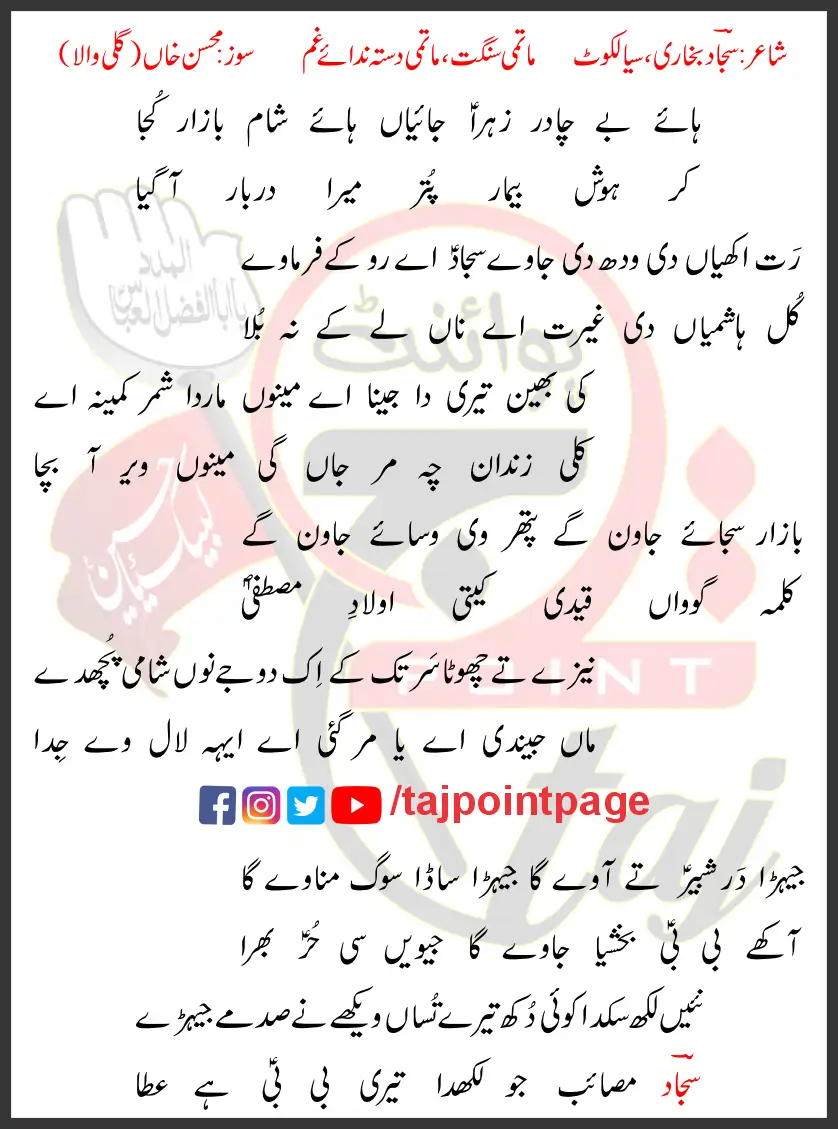 Be Dafan Lasha Haye Kazim Da Ro Ro Ke Aakhay Zahra Piyo Nu Dafna Jao.