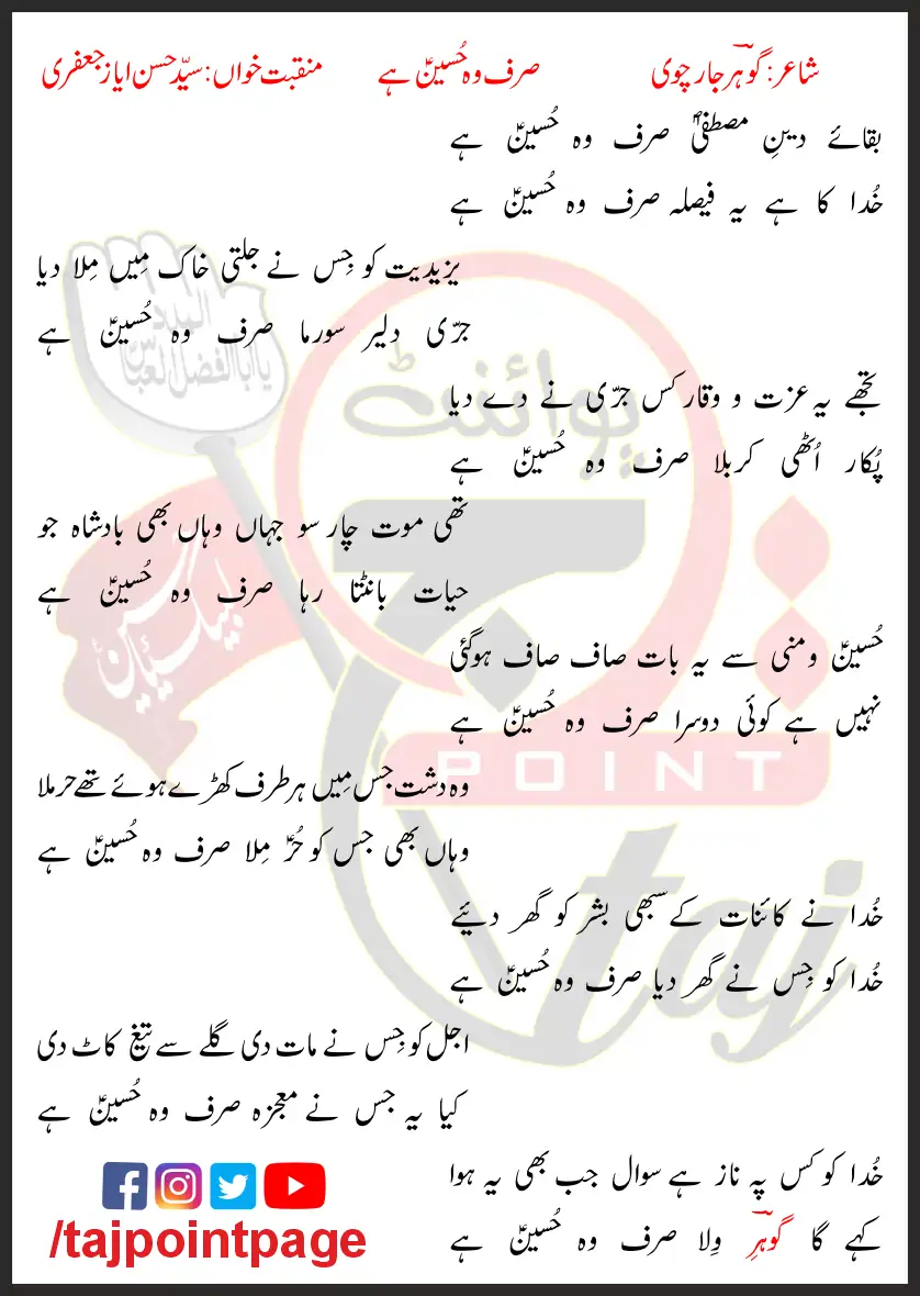 Sirf Wo Hussain Hai Syed Hassan Ayaz Jaffri Lyrics In Urdu and Roman Urdu