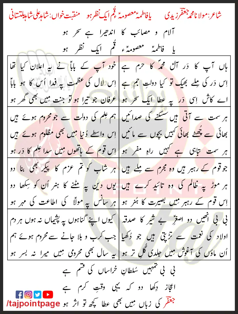 Ya Masooma e Qom Ek Nazar Ho Shahid Ali Shahid Baltistani Lyrics In Urdu 2022