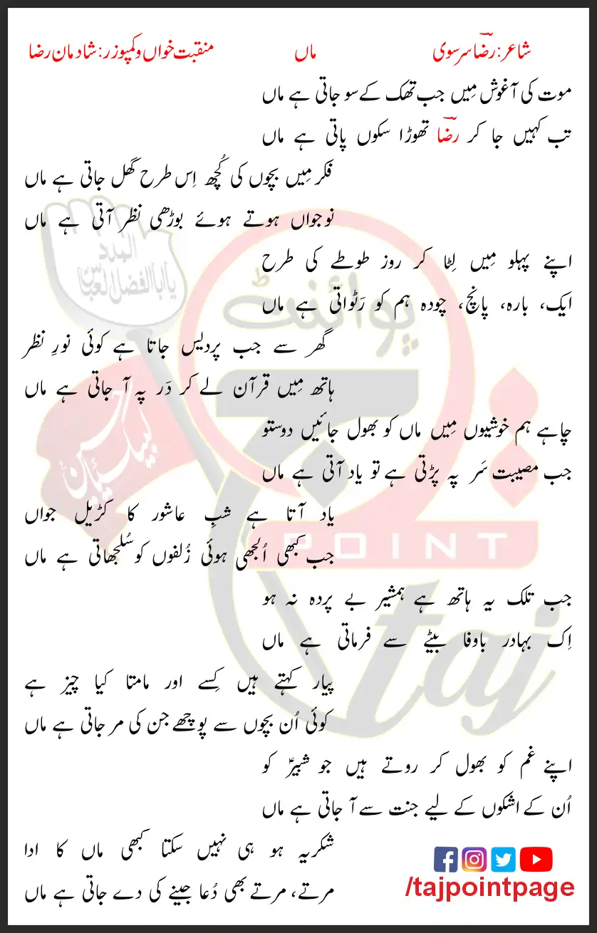 Maut Ki Aagosh Mein Jab Thak Ke So Jati Hai Maa – Shadman Raza Lyrics In Urdu 2008