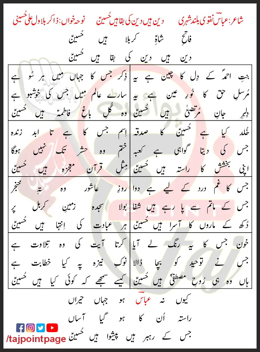 Deen Hain Deen Ki Baqa Hain Hussain Zakir Bilawal Ali Hussaini Lyrics In Urdu 2023