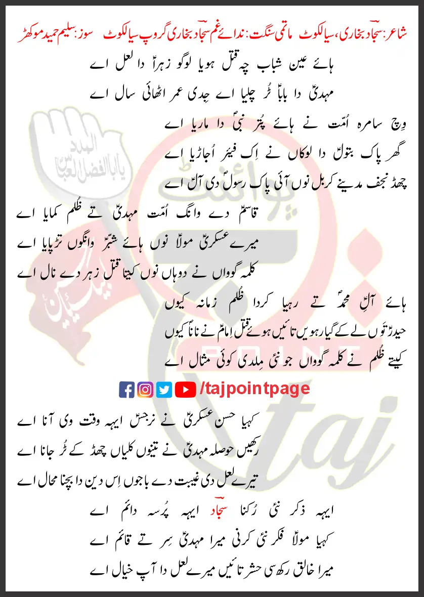 Haye Ain Shabab Che Qatal Hoya Logo Zahra Da Lal Aye Lyrics In Punjabi 2023