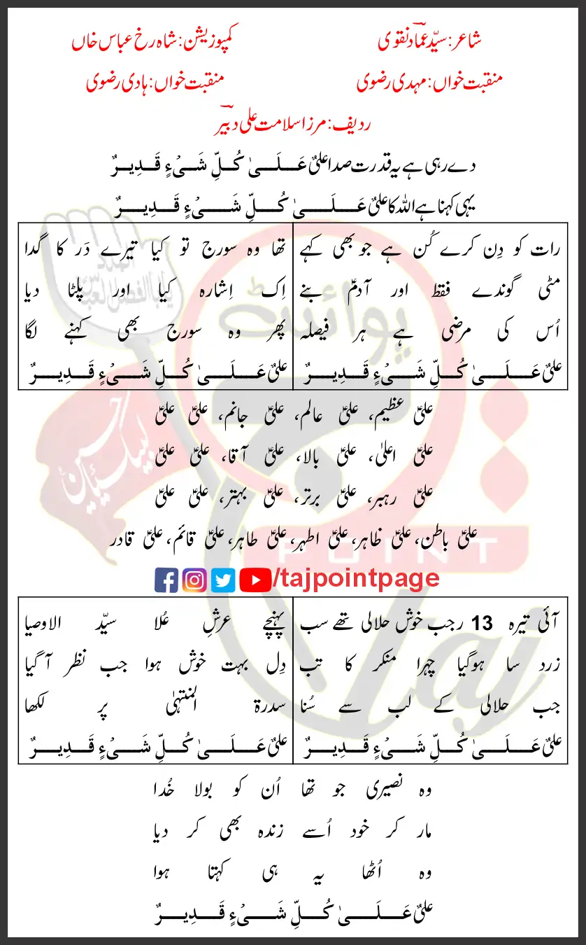 Ali Un Ala Kulle Shayin Qadeer Mehdi Rizvi Hadi Rizvi Lyrics Urdu 2026